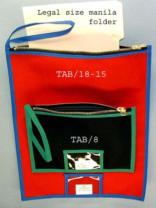 This red w/blue trim bag is a TAB/18-15 with a TAB/8 placed over it for size comparison. We have also placed a legal size folder inside which is hanging out only for photo purposes. This folder would go all the way down and fit easily inside with approximately two inches to spare. ALL TAB BAGS CAN BE EASILY ALTERED IN HEIGHT JUST BY ASKING! Contact